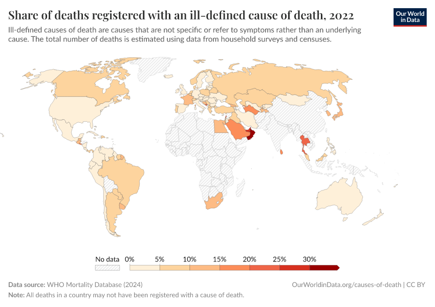 On the chart, you can see the share of deaths registered with an ill-defined cause of death across countries.
