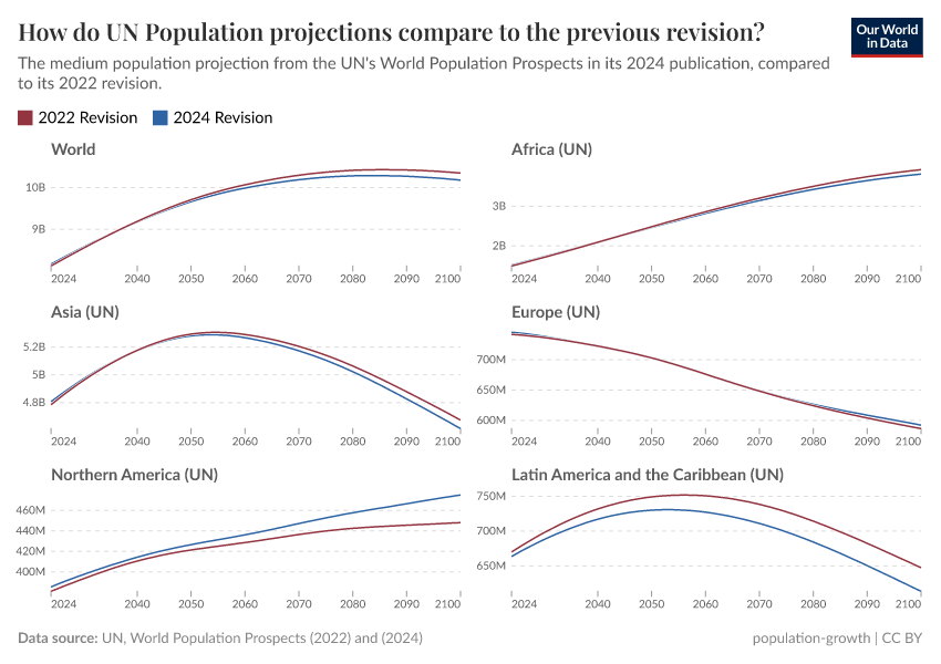 Not every country has seen a drop in projected population compared to the last edition. The chart below shows the differences between the two UN revisions, region by region. Note that the vertical axis scale for each region is different, allowing you to see the changes more clearly.