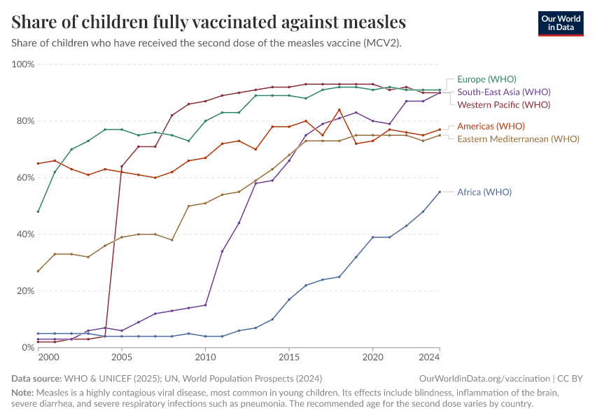 This has been a truly global effort, with more than 5 million children saved in every region, including over 50 million in Africa and 38 million in Southeast Asia. You can see the cumulative number of lives saved by WHO region in the chart below.